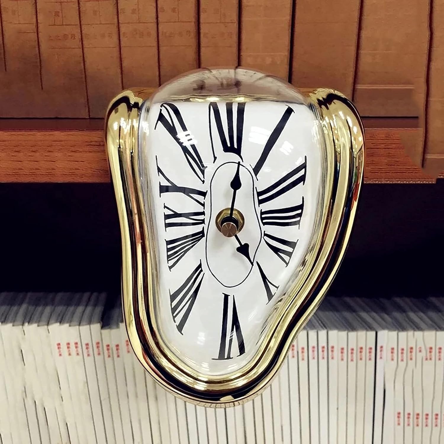 This clock is reminiscent of surrealist art, a curved surface adds a melting clock illusion that makes the clock look as if it is melting over the edge of the desktop. With its eye-catching design, this novelty clock is perfect for the waiting room, office, living or dining room, and any room of the house or workplace.